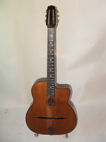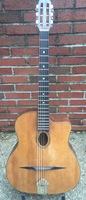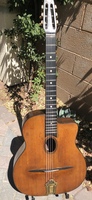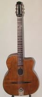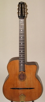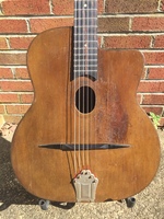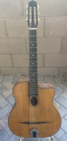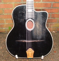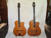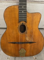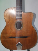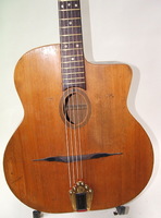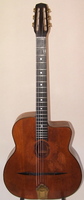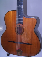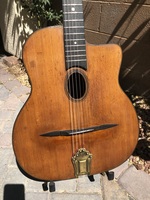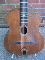 "Moyen Modèle" Egg shaped sound hole..680mm scale..made most probably during or soon after the War.. it has the same dimension of the Selmer guitar but 1cm shallower.. . solid spruce top, laminated walnut back and sides, and replaced ebony fingerboard, as well as a new set of tuners and tailpiece to replace the cheap old set that turned backwards, and the cheaper yet bent metal tailpiece.. the top has a couple of "Chanteaux".. as per shortages.. the playabiity is spot on and the sound is "superbe".. OHSC SOLD (BEST OF)