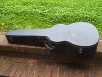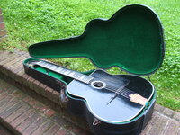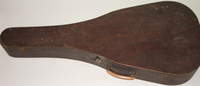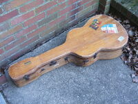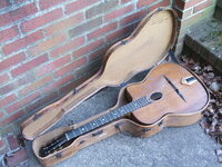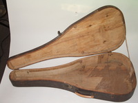 it came in a wooden case that looks original to me..not something that was build by an amateur, but a rather well constructed and well fitting job..missing all of it's interior lining..keeping the guitar "suspended" by bits of cork..!!