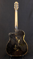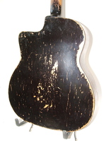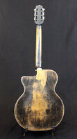 the finish is worn in large areas, giving it the charming look of the gypsy life..the neck is straight, the playability is perfect, and the bark is present..finished off with a most festive headstock...rival to none..!!