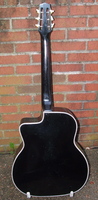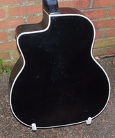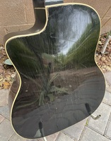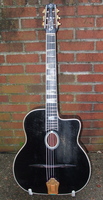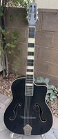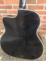 This is the first F hole Busato i have ever had.."Noire" because it is black all over..!! by the time it was built, the one feature that made it a "special" Jazz guitar was a radiused fingerboard, never seen so far on any other Busato..it is in excellent 100% original condition with it's original set of BB covered tuners and tailpiece. this guitar never had a pickguard, perhaps due to the fact that most players would remove them..670mm scale, with it's black finish it is hard to determine the outer wood it's made of, but it looks like it.could be mahogany. bits of the fingerboard inlays are broken off, but it does not hinder playing. the neck is quite modern in contour, and the playability is perfect.