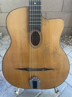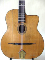 Known as the "Moyen Modèle"..Petite Bouche "Egg Shaped".. with the " Cité Griset" white label on the neck block..longer 680mm scale..Selmer size, but 1cm shallower.. laminated rosewood back and sides..solid spruce top..solid Walnut neck with ebony fingerboard.. this is a War time instrument, when materials were scarce. so this top was made of several pieces of spruce. considering that it was an "accepted practice", they gave those pieces a name.. "Chanteaux"..the top has several cracks..most noticeably one that runs the length of the top..it's been cleated and is stable. the guitar is outfitted with Schaller gypsy tuners and a Delaruelle Busato replica tailpiece..it was also refretted, so now the playabilty and action are perfect..the back of these are "thermo-formed" and not braced, so they are stiffer and produce an even barkier and more compressed sound than the others.. creating the distinctive in your face kinda voice.. this guitar wants to be played..!!! NHSC SOLD (BEST OF)