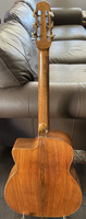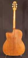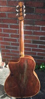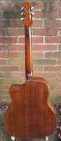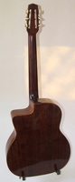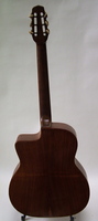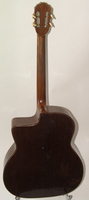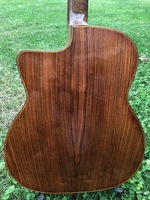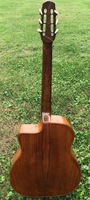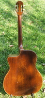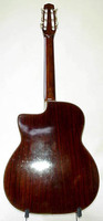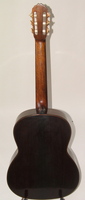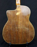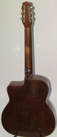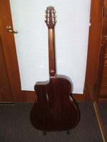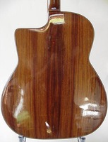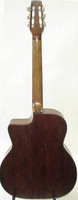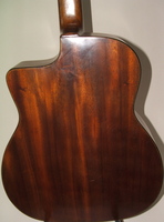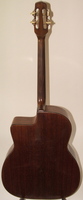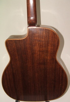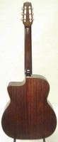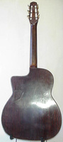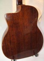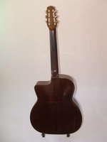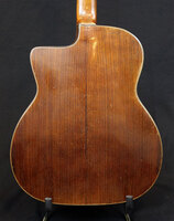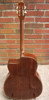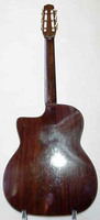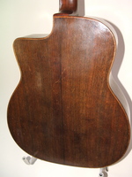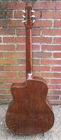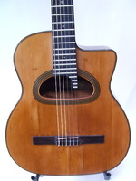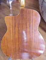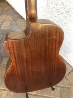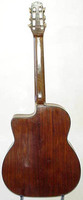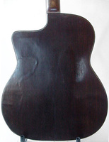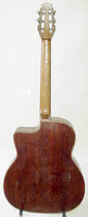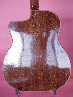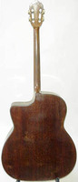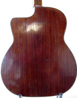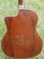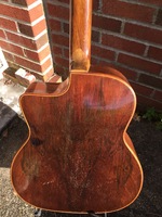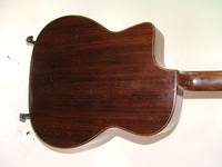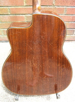 14 fret, brazillian rosewood back and sides,walnut neck and ebony fingerboard, this guitar suffered some terminal damage to it's back, and it was replaced with a beautiful solid brazilian new back.. in the process, several top cracks were also repaired, a pickguard was removed, it was refretted, and finally the back an sides were French polished.. the guitar sounds great and plays as well...it is fitted with a unique set of factory nickel plated tailpiece and tuners. NHSC SOLD (BEST OF)