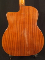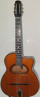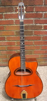 14 fret, mahogany back and sides, walnut neck and ebony fingerboard. this is one of the few mahogany Selmer's, at some point, someone tastefully inset a black pickguard on the top... it was a professional job..., this guitar sounds and plays excellent, and is a lovely example of Selmer's post war work... period European hard case. Period European Hard Case SOLD (BEST OF)