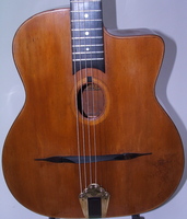 This guitar was sold on the 7th of October 1949 to a Mister Seurol..at some point in it's life, it became the property of Challain Ferré..you can see a photo of him playing on stage, the guitar as a Lefty.. since then, the black "stick on" pickguard was removed without damaging the guitar..it is the "classic" model. laminated rosewood back and sides..solid spruce top that is both "bombé" and "plié" at the bridge line.. the fingerboard was replaced and refretted at some point. the neck angle is perfect and does not show to have been resetted at any time..the action is spot on, and there is a second bridge in the case for those hygrometry variations.. in comes in a beautiful reissue case, that is the best copy of the original case.. sturdy and perfect fitting..