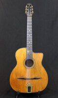 6 string with internal resonator. formerly owned by english guitarist LOUIS GALLO. this is a superlative instrument, being part of that initial batch of guitars that were send to London. For an instrument nearly 70 years old, it remains in exquisite condition, resting in it's beautiful original case. it has been refretted, and in the process, the fingerboard was thinned down. the dot markers are unoriginal, and there are some side dot makers added. At some point in it's life, the whole guitar was oversprayed. It still has the oversized clear plastic "pick protector" that can be seen on the 1972 cover picture of BMG, as well as the replaced bridge with a bone inset. Although the Selmer log states that this serial number was attributed to a 4 string, there is no definitive sign that this guitar was ever converted.. There have been numerous examples of serial number having been used twice and sometimes three times. This is likely one of those. It is in excellent condition without any cracks, and the sound is what sets this guitar apart.. making obvious why LOUIS GALLO chose to keep this guitar. OHSC SOLD (BEST OF)