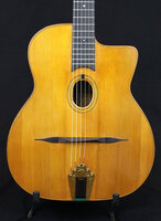 Bernard Desquaires bought this guitar brand new at the Selmer shop Place Dancourt on the 3rd of November 1949, and kept it for over 50 years..!! being unable to play it anymore, he decided it needed a new home.. rarely in the gypsy world, does one find an original guitar in the hands of the original owner, this is one such rare case... Bernard played and cared for this guitar... it is in excellent original condition, save for two small repaired cracks on the top, alongside the fingerboard extension, that were repaired, and cleated. the top still has it's original "bombé..Hank Marvin of "The Shadows" bought this guitar and added it to his already extensive gypsy guitar collection..admitting that one can only play one guitar at a time, after years of playing it, he sent it back to me to offer it to the next luck guy who will own this tremendous sounding and playing guitar.. NHSC SOLD (BEST OF)