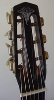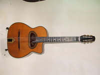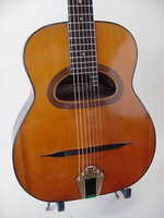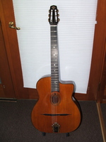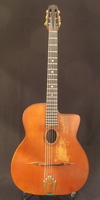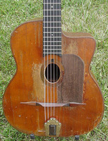 this is truly an extraordinary instrument, with an extraordinary life.. I will never attempt to upstage Stan Jay when it comes to diatribe..he is the uncontested master of it.. and so I will try to make it short and sweet.. only a handfull of these were ever built, and this one has traveled very well in time.. it surfaced in the hands of an old gypsy in the Swiss Alps... how about that Stan..???!!! when I got it, it was set up Spanish... proving that one does not need a cutaway to play gypsy music... it is now set up Hawaiian.. but with a simple switch of bridge, tailpiece and nut, the guitar becomes a perfectly