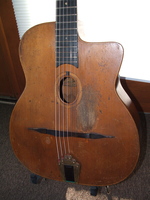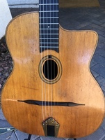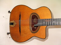 they "decided" to eliminate the "stairstep" outline of the "Classique" and repositionned the Selmer brand to accomodate.. it sports the early patent number suggesting it having been built before July 1932..it has signs of having had at some point some sort of tailpiece.. even TWO sorts of tailpieces.. but yet not showing anywhere on the the guitar any signs of damage from those installations.. in 1933, Mario leaves the Selmer company, and the direction of the Atelier..during and after that period, a number of drastic changes are made..the internal resonator is abandonned, and models are modified, transformed, or simplified.. could this guitar be one of them..