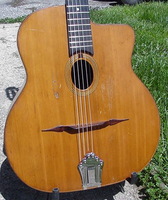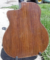 laminated Indian rosewood back and sides.. three piece maple neck, ebony fingerboard, this guitar shows a little bit of gypsy life.. primarely a hit on the top that is kinda ugly, but has no bearing on the integrity of the top...great gypsy voice..excellent playability.. NHSC