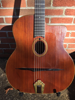 I bought this guitar from BIRELI LAGRENE in early 2001...sold it..bought it back..sold it.. and now it's back in my life for the third time.. three piece maple neck with ebony fingerboard..laminated rosewood back and sides solid cedar top... outfitted with a set of DR tuners and tailpiece.. over the course of it's life, it was refretted, and shows signs of a light overspray.. it has the Jacques label with his signature.. he was "retired" but would come to the workshop once a week to lend a hand to Jean Pierre and Ugo.. this is a perfect example of their work in great shape..no cracks anywhere..playability ..tone..sustain..reverb..volume.. a great guitar that needs nothing but to be played.. NHSC SOLD (BEST OF)