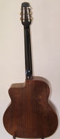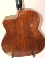Laminated rosewood back and sides, solid spruce top, three piece maple neck with ebony fingerboard. the guitar shows a bit of gypsy life, with a hit on the top, and some scratches.