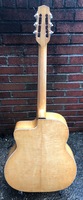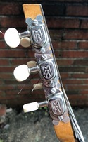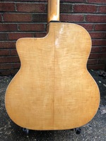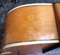 three piece Maple neck, with an Ebony fingerboard, laminated curly Maple back and sides..at some point in it's life, the guitar had a couple knobs on the upperside of the guitar.. as was the "practice" to have "onboard" controls, in the 80's and 90's.. the holes were masterfully plugged..the guitar also had a pickguard, which was also masterfully removed, with a super thin finish application in the area.. and finally it suffered a "bump" on the side...it is outfitted today with a beautiful set of Miller Replica Tuners...and now for the really good stuff.. the guitar plays and sounds great.. needing absolutely nothing done