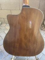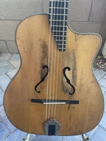Here we have a rare guitar by an elusive Luthier, who like many predecessors immigrated to France, and set up shop in Paris. this model is different in many ways from the "standard" gypsy style guitar..with a pronounced arched spruce top, and two squiggly F holes, it's made of laminated Walnut back and sides, with a solid Mahogany neck..it originally had a darkened soft wood fingerboard with long parallel inserts..due to the scarcity of Ebony.. the fingerboard is replaced with an solid Ebony board and was refretted.. War time bend metal Tailpiece, and original tuners that turn backwards..copy of the original bridge with a bone insert..there is one crack that has been filled and is not moving at all..the body is missing some binding here and there. the playability has been fully restored.. the sound is warm and open, yet not lacking for bark..an original rarity..!! NHSC SOLD (BEST OF)