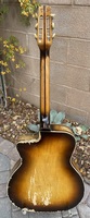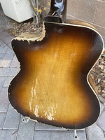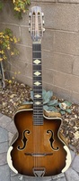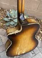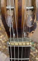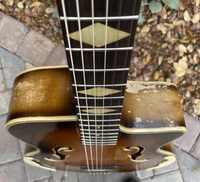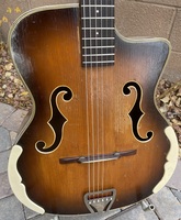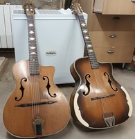 We have here a rare model Chorus Deluxe, with original arm and knee "rests". the finish has somewhat peeled off over the years, as can be seen in the various photos. one interesting detail, on the headstock, is the presence of the two "stiffening" aluminium bars sticking out at the end..directly "borrowed" from the Maccaferri design, installed in two channels standing "on end" to afford rigidity to the neck without adding significant wait.. the body and sides are maple as well as the two piece neck with a refretted rosewood fingerboard. SB tuners that turn the "right"way, making this guitar one of the earliest to have them installed..original Tailpiece that will only accept loop end strings..original adjustable rosewood bridge, multi-ply binding, bound F holes, all being part tof the "Deluxe" appointments..this guitar plays and sounds great.. to illustrate the difference between a regular Chorus and the Deluxe, you can see a photo of them next to each other.. the regular has non original moustaches and bridge. NHSC