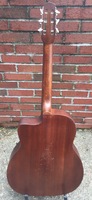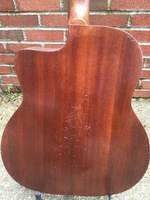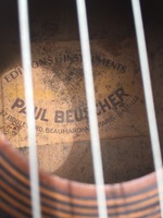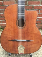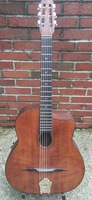 12 fret model.. 640 mm scale.. this is only the second such guitar i have ever had... similar in every way, to the earlier one same material, same construction.. no maker's mark.. apart from the Paul Beuscher label.. laminated mahogany back and sides..solid spruce top.. two piece mahogany neck..ebony fingerboard.. excellent craftsmanship..a high quality instrument in every way..save for the crummy tuners and tailpiece.. it is now outfitted with Schaller gypsy tuners, and repro tailpiece.. the fingerboard was refretted..one top crack cleated and repaired, overall great condition..the playability is spot on, and the sound is OUSTANDING...!!! NHSC SOLD (BEST OF)