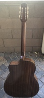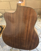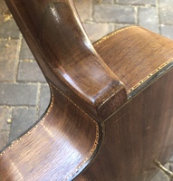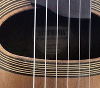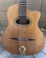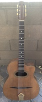 This is a really good example from a family that has been building guitars in Paris for decades, joining the ranks of established Italian Luthiers.. laminated Mahogany back and sides, solid Spruce top, with a Rosewood fingerboard, 670mm scale, with a really comfortable and fast neck. it has been refretted, and outfitted with modern tuners and tailpiece..it came with really crummy tuners of that period that turned backwards and an equally crummy tailpiece. there is a "Symphonia" label on the inside, which was a retail shop boulevard Magenta that sold String and Wind Instruments. no cracks anywhere, just some honest dings here and there..you can remark the lovely touch of marquetry all around the rims of the guitar, as per Castelluccia's tradition.. the guitar plays and sounds great, with an extraordinary amount of built in reverberation in the upper register, as well as a resonant bottom end..the guitar weighs 3lbs 12 oz.. light and lively.. NHSC SOLD (BEST OF)