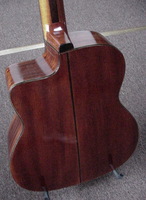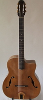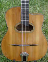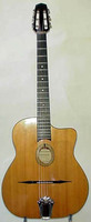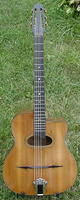 Brazilian laminated back and sides, solid spruce top, mahogany neck with ebony fingerboard. Castelluccia guitars are rare, and like Favino, this Jacques has been retired for a long while..the guitar has a chunky neck reminiscent of a 50's Gibson. it is in near new condition and the sound is outstanding.. staking up against any gypsy guitar. NHSC SOLD