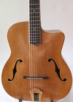 670mm scale,this guitar bears a Paul Beuscher label, and was build by Jacques Castellucia, at a time when many makers were "jobbing' their production to the larger retail houses. In 2000, a certain luthier R. Dallaine restored it and promptly added his label as well..60's 14 fret D hole are quite rare, and this example offers a perfect balance of sound, playability and price.. NHSC SOLD