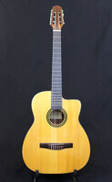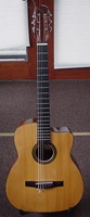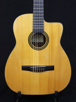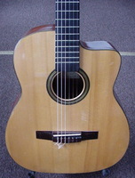 This is jacques Castellucia's, or Jean Baptiste's version of the Maccaferri "Concert" Classical.(good luck sorting out the family's fondness for only two first names) this one is a 14 fret cutaway, solid Spruce top, solid two piece Mahogany back, and sides, Ebony fingerboard, three piece "sandwich" neck .. two piece Mahogany and one piece Rosewood for strength. As the label reads, she is " faite à la main" "made by the hand"... It has a lovely voice, plenty of volume and is very easy to play. NHSC SOLD