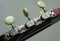 it is sporting the Castellucia tailpiece, and a beautiful set of golden SB tuners. the neck is reminiscent of the original Selmer profile, D shaped.. laminated mahogany back and sides, arched spruce top, mahogany neck with an Ebony fingerboard. this is a classic gypsy guitar