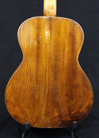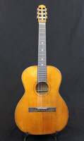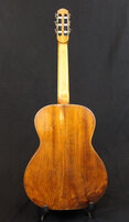 This guitar screams of the early influence the Master Luthier Luigi Mozzani had on his talented pupil..made in Cento Italy, one can see in the shape of the headstock and the heel of the neck, the Maccaferri/Selmer guitar to be born..the elongated bridge with compensated saddles, the "grafted" headstock.. it is made of solid Chesnut back and sides, solid European Spruce top, and what could be a Walnut neck with an Ebony fingerboard. the guitar has no cracks and the original finish remains, now fitted with a beautiful set of Irving Sloane classical tuners.. the sound is lively, well balanced, and a pleasure to play.. it is the first and only original Classical guitar made by Mario Maccaferri i have ever had in 44 years.. NHSC SOLD (BEST OF)