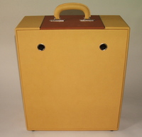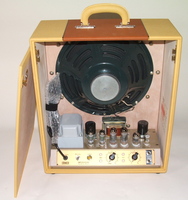 12 watts..single 12' speaker..2 knobs..gain and tone..(i love that).. pair this up with a vintage or reissue Stimer Pick Up, and you've got your Django rig today..weighs 20 pounds, portable and ultra cool..beautiful leatherette covering.. so yummy you want to lick it.. what other amplification could you possibly need..?? in like new condition.. comes with the TWO original shipping cartons.. SOLD (BEST OF)